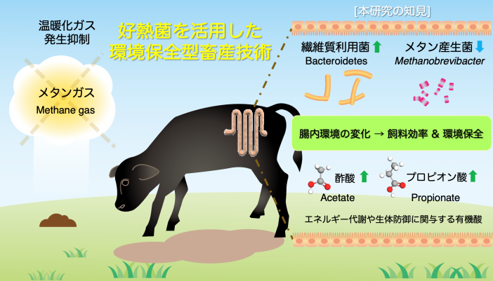 日本国内でも、独自の視点からの研究開発が進められています。九州大学では、仔牛の段階で「好熱菌」を与えるプロバイオティクス手法により、メタン産生菌を減少させると同時に飼料効率を向上させることが実証されました。