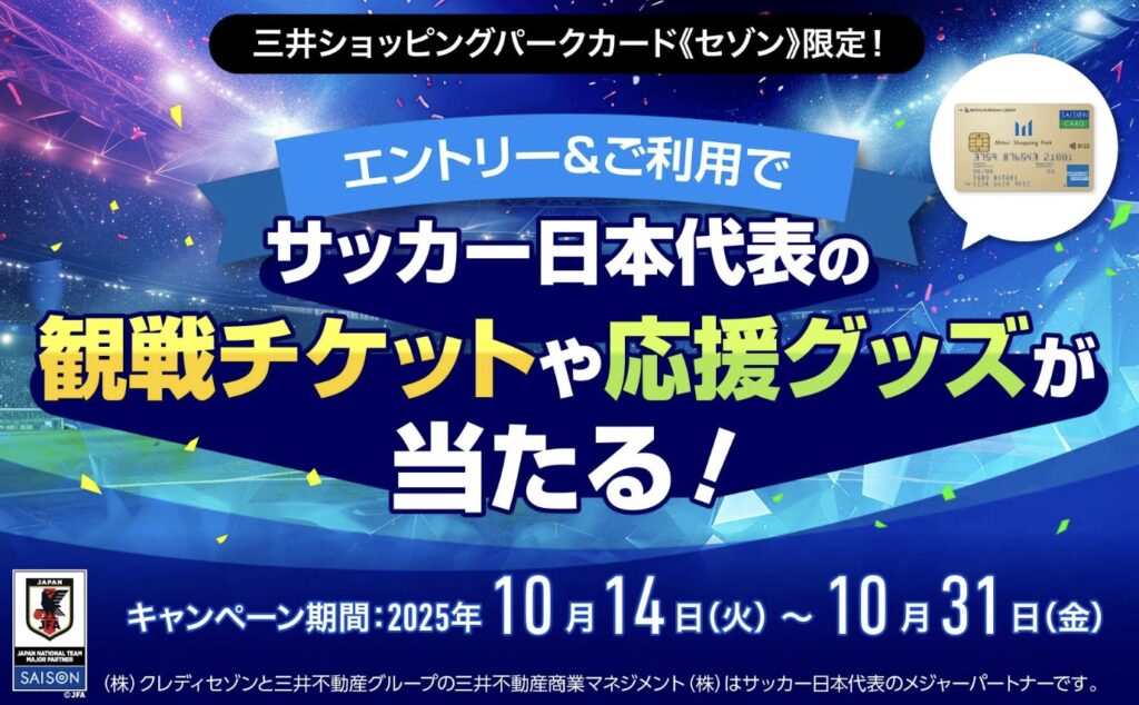 • 内容: キャンペーンへのエントリーとカード利用で、サッカー日本代表の観戦チケットや応援グッズが抽選で当たるキャンペーンです。こちらは新規入会者だけでなく、既存会員も対象となっています。