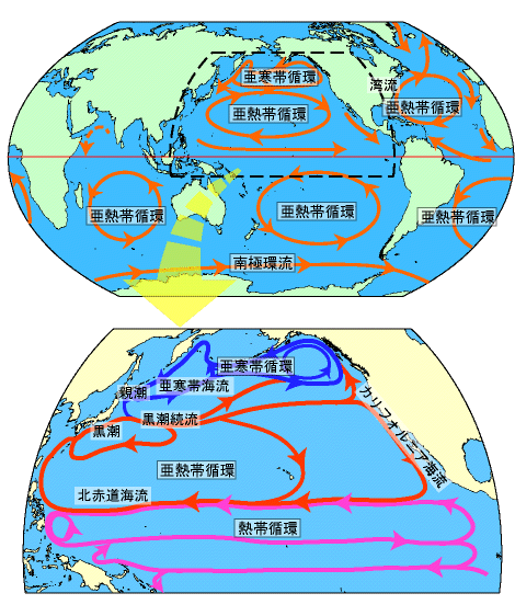 地球上の主要な海洋には、貿易風や偏西風などの恒常風とコリオリの力によって形成される巨大な円を描く環流(ジャイア)が存在します。これらの環流には、亜熱帯域に形成される比較的暖かい亜熱帯環流や、高緯度地域に形成される冷たい亜寒帯環流などがあります。