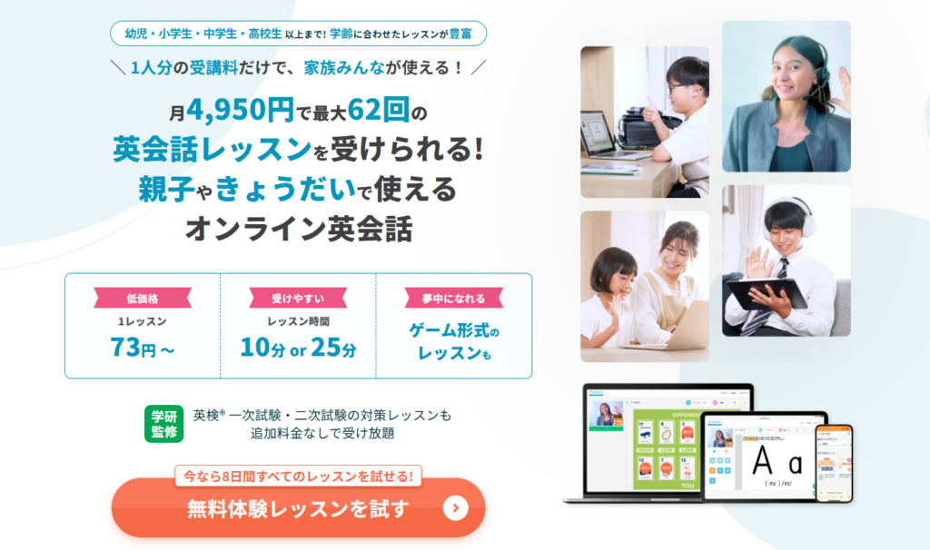 兄弟や保護者とアカウントを共有でき、家庭全体で英語に触れられます。