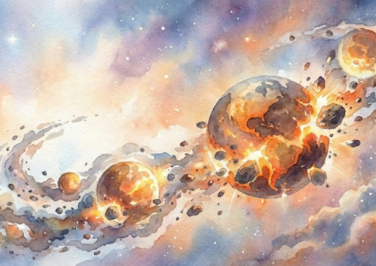 太陽系誕生直後、ガスと塵が豊富な「原始惑星系円盤」の中で、塵同士が結合して数km規模の「微惑星」が無数に生まれました。これらの微惑星は互いの重力で引き寄せられ、衝突と合体を繰り返しながら、より大きな天体へと成長していきます。