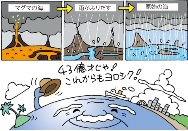 当時の海洋は酸性でしたが、長い時間をかけて岩石成分と反応し、現在の海水に近い組成へと中和されていきました。