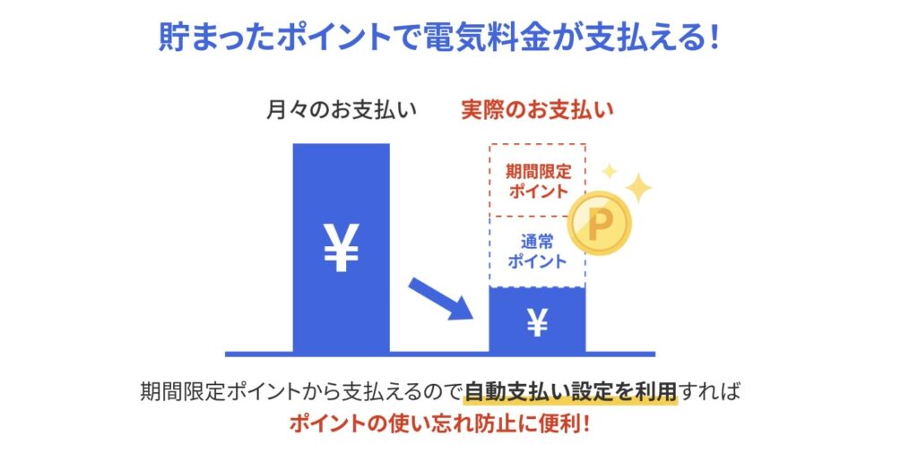 通常のポイントだけでなく、有効期限が短い(約45日など)「期間限定ポイント」も、設定さえしておけば毎月自動的に電気代の支払いに充てられます。