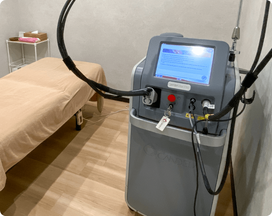 施術には、痛みを抑えながら効果を高める熱破壊式レーザーと蓄熱式レーザーを併用。毛質や部位に応じて使い分けるため、濃い髭やVIOでも効率よく脱毛できます。