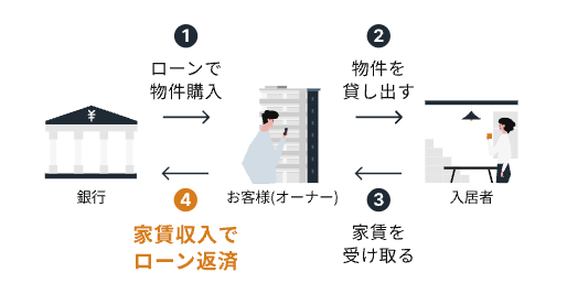 RENOSYを含む不動産投資は、初期投資費用を回収するまでに年単位の時間を要します。家賃収入を長く受け取る為に、融資を活用して運用した場合、ローン完済後に家賃収入が入ってくる仕組みです。家賃収入を長く得るためには長期保有と複数物件での運用がおすすめです。