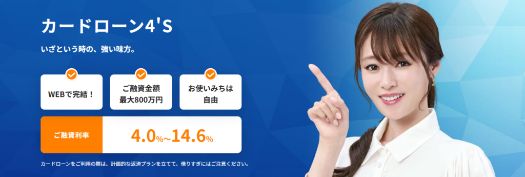 「カードローン4’S」の金利は、年4.0%〜14.6%の範囲内で設定される固定金利制です。利用限度額は10万円から最大800万円までとなっており、10万円単位で細かく希望を出せます。