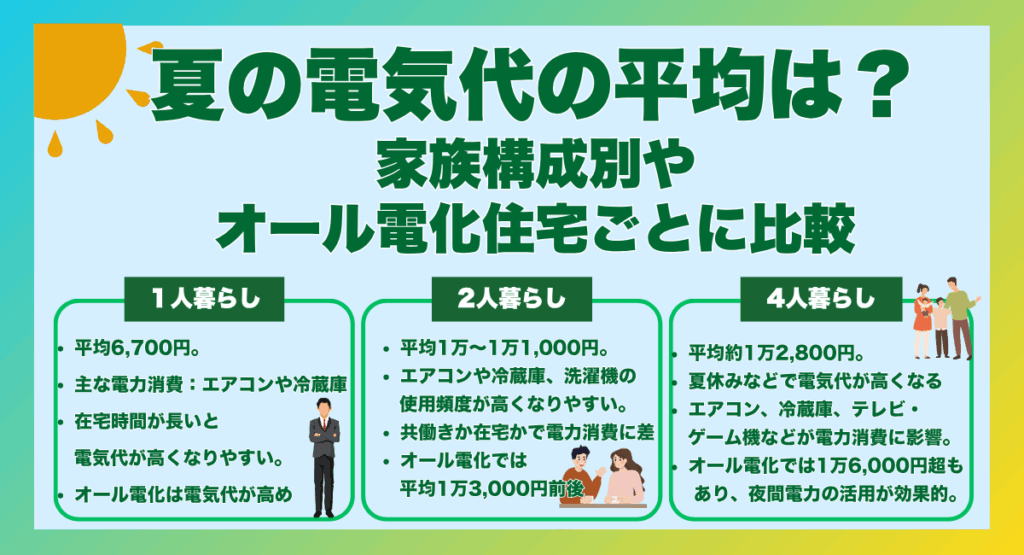 この章では、家族構成ごとに夏の電気代の目安を紹介しながら、オール電化住宅との違いも比較します。