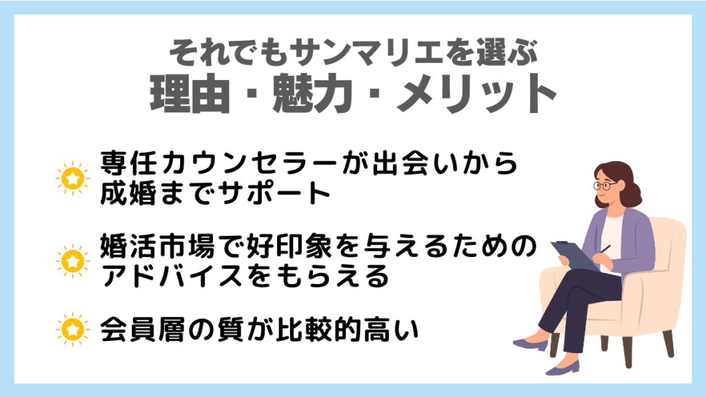 結論として、サンマリエは専任カウンセラー制と独自の紹介システムを強みにしています。