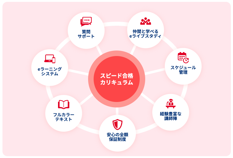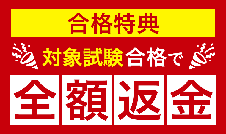 業界最高水準の合格率。フルカラーテキストと回数無制限の質問サポートで、短期間でも着実に合格力を養成。合格すれば受講料が全額返金される点も大きな魅力です。