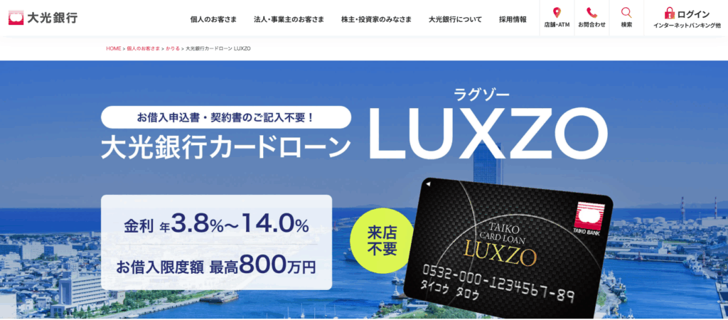 たいこうカードローンLUXZO(ラグゾー)は、大光銀行のカードローンの中でも限度額が大きく、低金利で利用できるのが特徴の商品です。