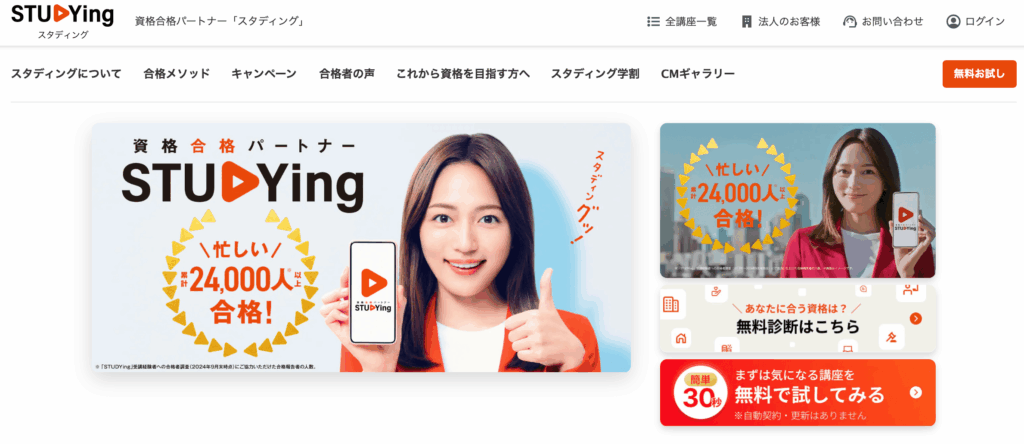KIYOラーニング株式会社が提供している通信講座です。2008年より「通勤講座」の名称でサービスを展開していましたが、2018年にスタディングという名称に変更しました。