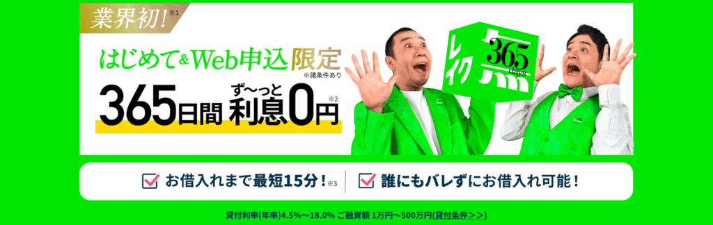 「レイク」ではただいま、業界初の365日間利息0円となっています。