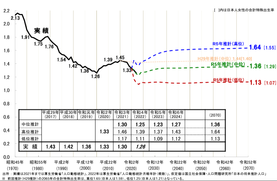 全体の推計を見てみると、2023年までは出生率が減少し、その後に回復してから、2070年には低位推測でも1.13と、2024年より0.01少ないだけにとどまっています。今後、どのようにして出生率を高めていくのかは、引き続き課題になりそうです。