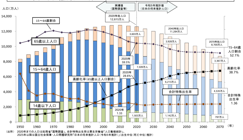 国勢調査などによると、2020年の日本の総人口は1億2,000万人あまりだったのに対して、将来の人口は、2040年では約1億1,000万人と減少し、2070年には8千700万人と9,000万人を下回る見通しです。
