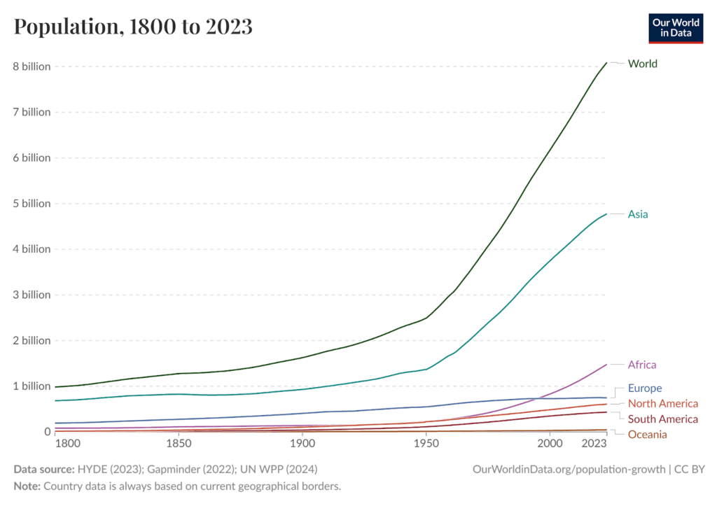 次に、伸びの大きい1800年から2023年に注目していきましょう。そうすると、急増しているのは1950年以降であることが分かります。1950年の世界人口は24億9000万人、2000年は61億7000万人と半世紀のうちに倍以上に増えています。