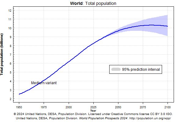 世界の人口は今後も上昇を続け、2080年代には2024年の82億人から21億人増の103億人となり、ピークを迎える見込みです。そして、その後は緩やかに減少し、21世紀末には102億人になると予想されています。