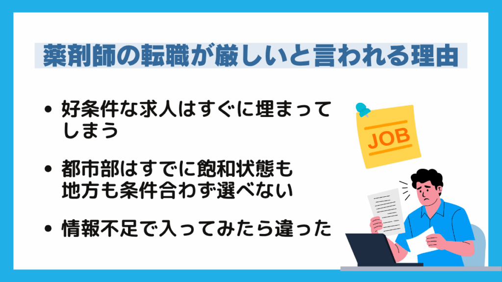 薬剤師の転職が厳しいと言われるのは、好条件の求人がすぐに埋まることや、都市部の飽和・地方の条件ミスマッチが大きな要因です。