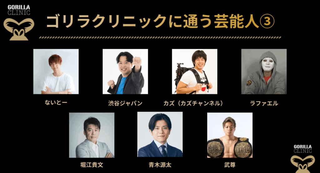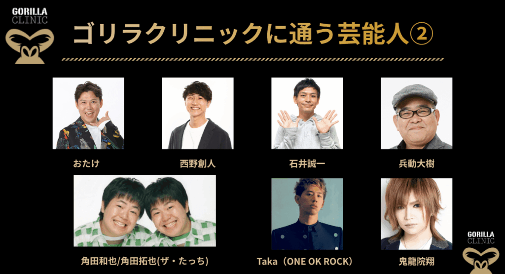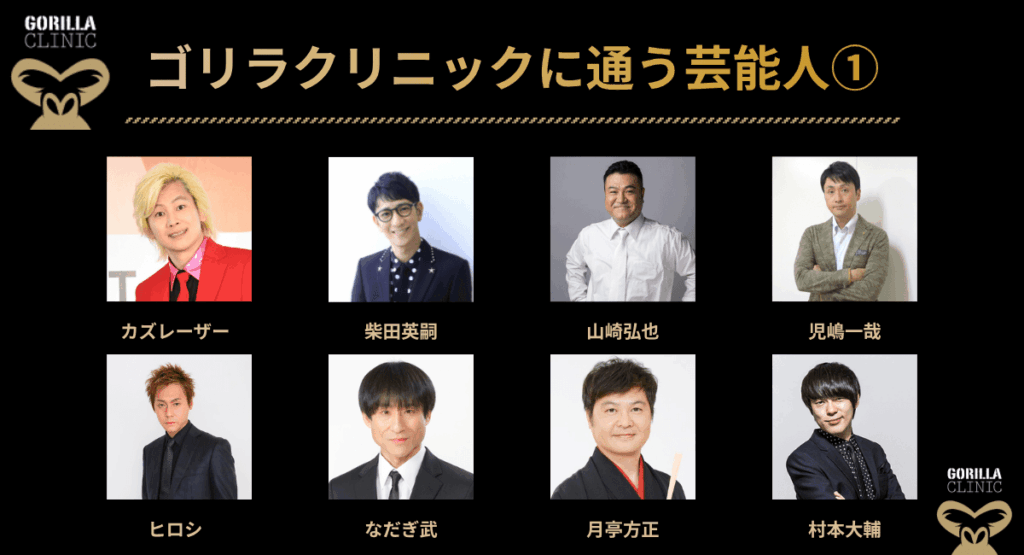 ゴリラクリニックは芸能人の利用が多く、実際の体験談が信頼性を高めています。どんな著名人が通っているのかを知ることで、施術のイメージがより具体的になります。